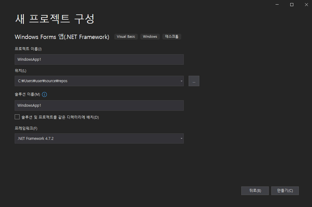 이런 식으로 뜨는데 Windows Form 앱(.NET Framework)를 찾아서 누른 신 다음에 다음(N)을 눌러주세요