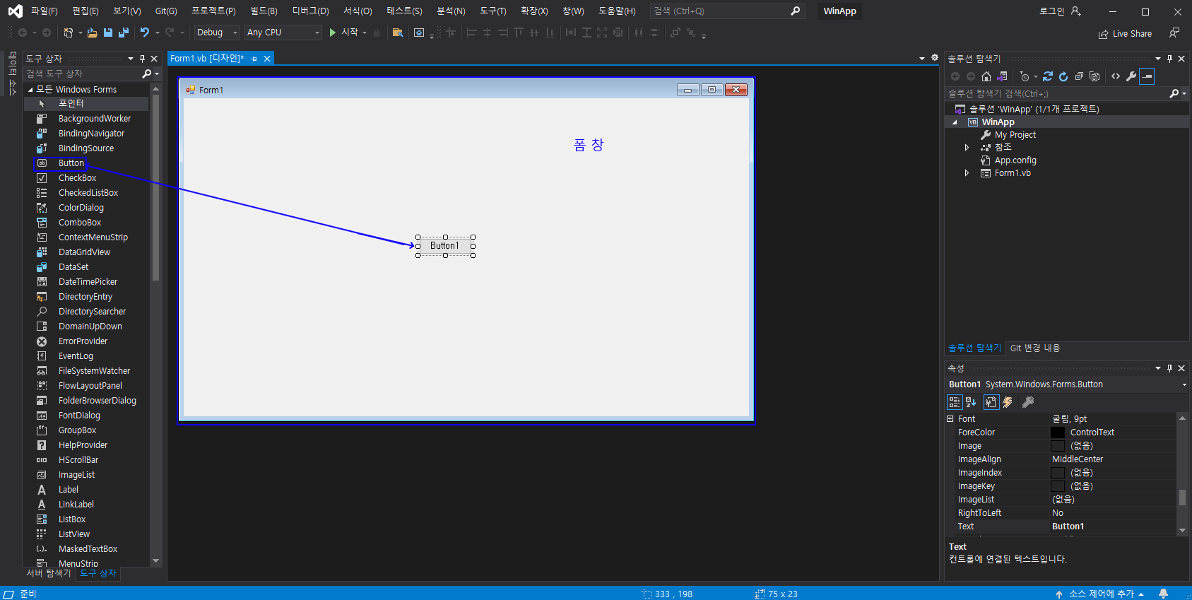Button을 눌러 폼창으로 드래그를 해주시면 저렇게 뜹니다. Button의 크기를 키워주세요.